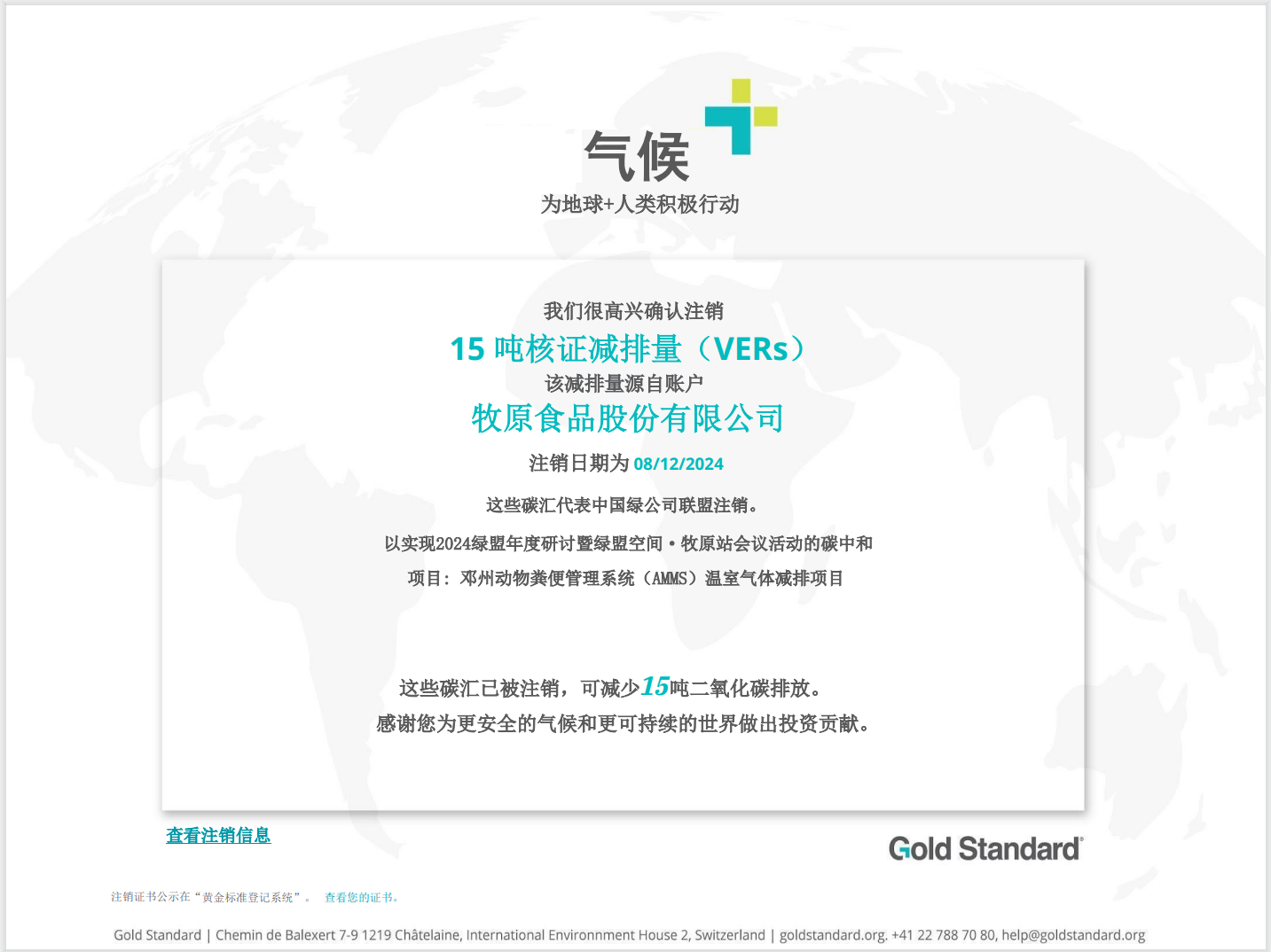 在牧原的支持下,本次活動根據(jù)生態(tài)環(huán)境部發(fā)布的《大型活動碳中和實施指南(試行)》,核算了本次會議的溫室氣體排放量,合計14.23噸CO2e。牧原使用在黃金標準(GS)登記簽發(fā)的15噸減排量進行抵消,實現(xiàn)了本次會議的碳中和。牧原也將為綠盟活動實現(xiàn)碳中和做出持續(xù)的貢獻。